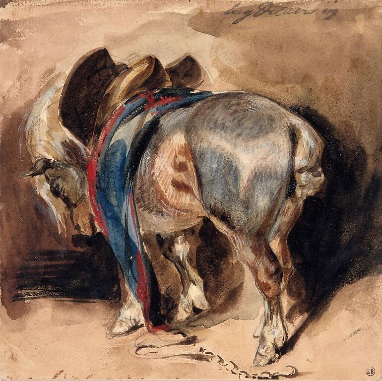 Œuvre de : Delacroix, Eugène Hauteur de l'original : 15,00 cm Largeur de l'original : 15,50 cm Période : 19e siècle, période contemporaine de 1789 à 1914 Technique : aquarelle, fusain, gouache Delacroix Eugène - Cheval tourné à gauche - aquarelle, fusain, gouache © RMN-Grand Palais