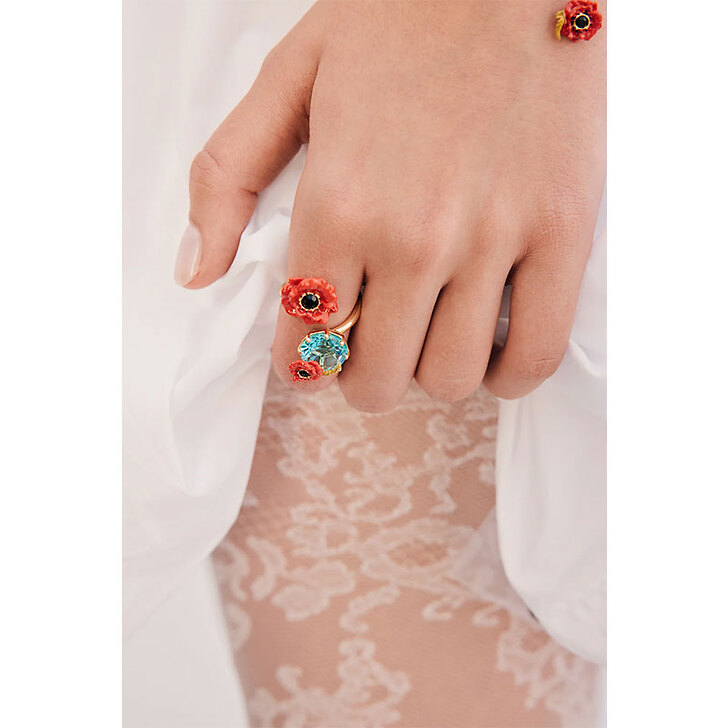 Bague ajustable en laiton doré à l'or fin, pierre ronde en verre facetté bleu azur, petite fleur de coquelicot rouge peinte à la main ornée d'un cristal noir en son centre.