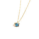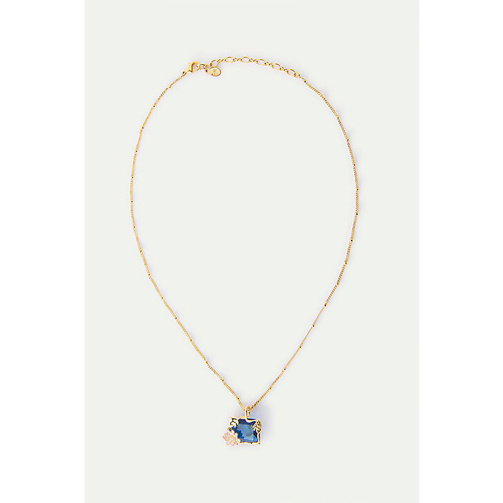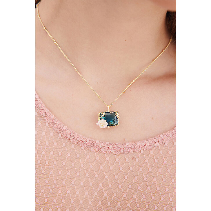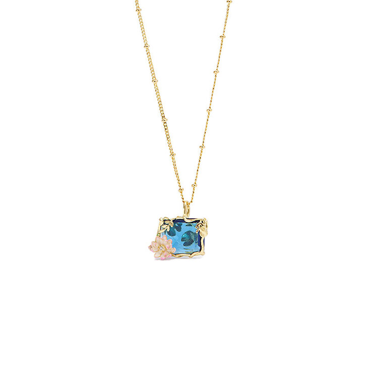 Collier pendentif pierre taille émeraude en verre facetté bleu clair translucide, ornée d'une petite fleur de nymphéa rose peinte à la main et d'un cristal blanc, feuilles et fleurs de lotus en laiton doré à l'or fin.