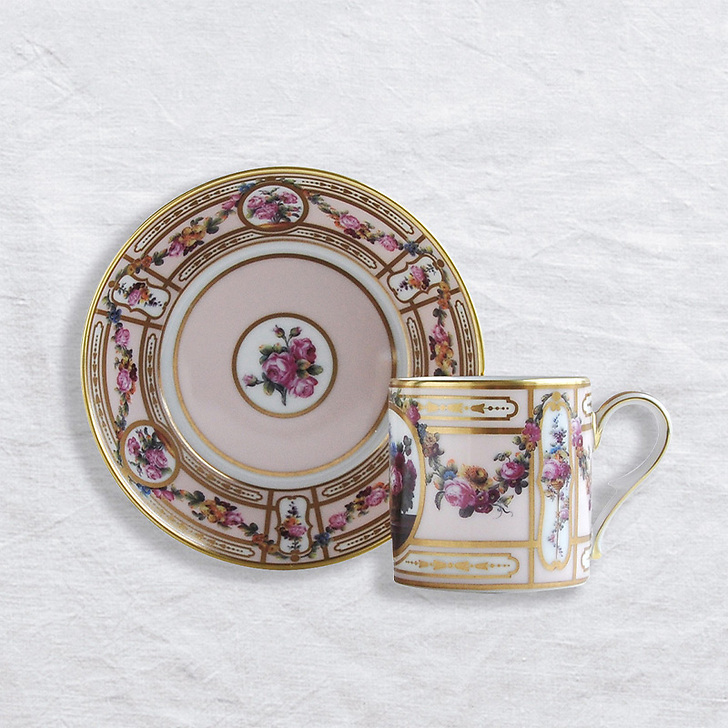 Dessinée à l'époque à quatre mains, par Jean Chauvaux, peintre majeur à Sèvres, actif entre 1764 et 1800 et Nicolas Sinsson, actif de 1773 à 1795, cette tasse d'une grande délicatesse, est rehaussée par un rose poudré exquis.