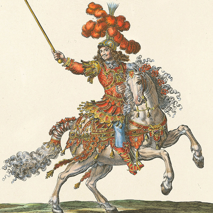 Accompagnés de tambours, trompettes et habillés selon les costumes d'Henry Gissey, les 5 quadrilles s'affrontent en deux courses : l'une de bague consistant à faire passer une lance ou un javelot à l'intérieur d'un anneau, et l'une de tête, cherchant à transpercer des têtes de Turcs, de Maures ou de Méduse en carton.