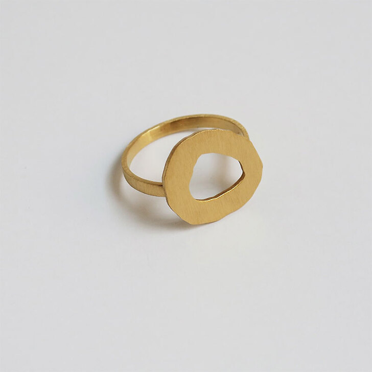 Réalisée en métal doré avec bain d'or 24 K carats et émail à froid. Forme d'un cercle vide.