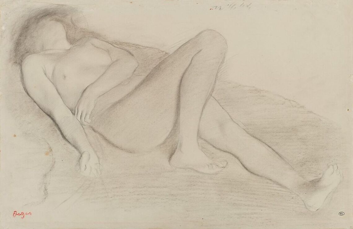Œuvre de : Degas, Edgar Hauteur de l'original : 23,00 cm Largeur de l'original : 35,50 cm Période : période contemporaine de 1789 à 1914, 19e siècle Technique : estompe, crayon noir Degas, Edgar - Femme nue, étendue sur le dos - estompe, crayon noir © RMN-Grand Palais (musée d'Orsay)