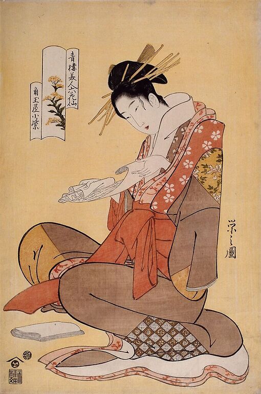 Œuvre de : Eishi, Chôbunsai Hauteur de l'original : 38,60 cm Largeur de l'original : 25,90 cm Période : 18e siècle, 19e siècle Technique : estampe nishike-e Eishi, Chôbunsai - La courtisane Komurasaki de Kadotamaya - estampe nishike-e © RMN-Grand Palais (musée Guimet, Paris)