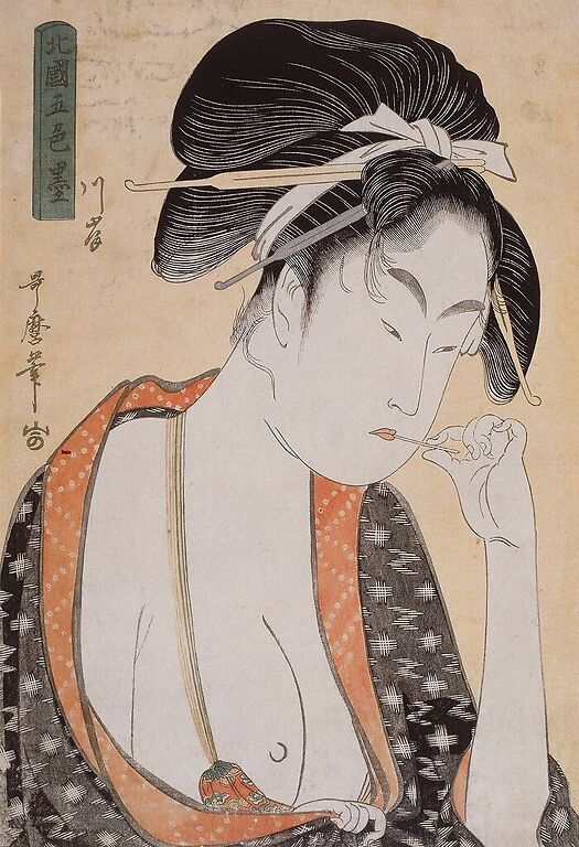 Œuvre de : Utamaro, Kitagawa Hauteur de l'original : 37,20 cm Largeur de l'original : 25,50 cm Période : époque Edo (1603-1868) Technique : estampe nishike-e, encre (dessin) Utamaro, Kitagawa - Cinq couleurs d'encre du quartier Nord : une prostituée du quartier des douves - estampe nishike-e, encre (dessin) © RMN-Grand Palais (musée Guimet, Paris)