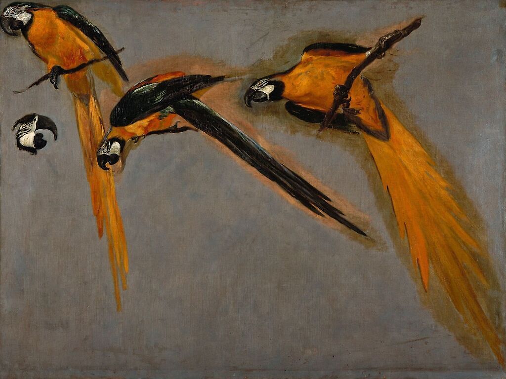 Trois perroquets aras et une tête