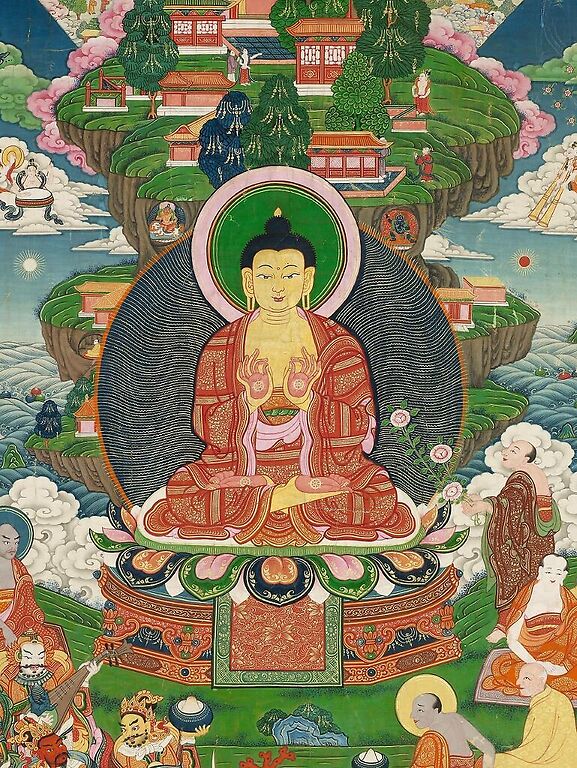 Œuvre de : Anonyme Hauteur de l'original : 68,50 cm Largeur de l'original : 48,00 cm Période : 19e siècle Technique : peinture sur toile, gouache Anonyme - Scène de la vie de Buddha : le grand miracle de Svaravati - peinture sur toile, gouache © RMN-Grand Palais (musée Guimet, Paris)