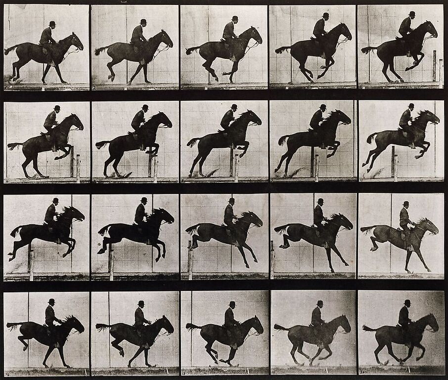 Œuvre de : Muybridge Eadweard Hauteur de l'original : 25,50 cm Largeur de l'original : 30,00 cm Période : 19e siècle Technique : chronophotographie, héliogravure Muybridge Eadweard - Saut d'obstacle, cheval noir - chronophotographie, héliogravure © RMN-Grand Palais (musée d'Orsay)