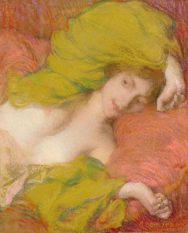 Œuvre de : Aman-Jean Edmond Hauteur de l'original : 61,00 cm Largeur de l'original : 50,00 cm Période : 19e siècle, période contemporaine de 1789 à 1914 Technique : pastel Aman-Jean Edmond - Farniente ou Etude de femme drapée les mains levées - pastel © RMN-Grand Palais (musée d'Orsay)