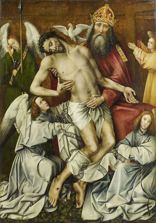 Œuvre de : Coter Colijn de Hauteur de l'original : 167,00 cm Largeur de l'original : 118,00 cm Période : 16e siècle, période médiévale - Bas Moyen Âge Technique : huile sur bois Coter Colijn de - Le Trône de Grâce ou la Sainte Trinité avec Dieu le fils soutenu par Dieu le Père - huile sur bois Photo © RMN-Grand Palais (musée du Louvre)