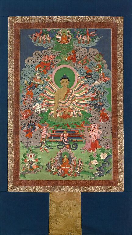 Œuvre de : Anonyme Les assauts de Mara, thangka d'une suite consacrée aux principaux épisodes de la vie du Bouddha, seconde moitié du XIXe siècle, Tibet oriental Xylographie peinte sur toile. H. 74,2 ; L. 45,4 cm (peinture seule) © Photo MNAAG, Paris, dist. Rmn-Grand Palais - T. Ollivier © Rmn - Grand Palais, Paris 2019 - IC 62 0316