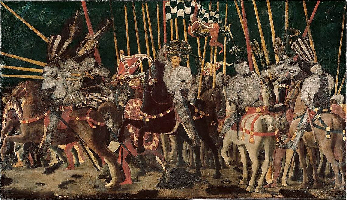 Œuvre de : Paolo di Donno, dit Paolo Ucello Paolo di Donno, dit Paolo Ucello, La Bataille de San Romano : la contre-attaque de Micheletto Attendolo da Cottignola Paris, musée du Louvre, département des Peintures © Photo Rmn - GP (musée du Louvre) - J.-G. Berizzi