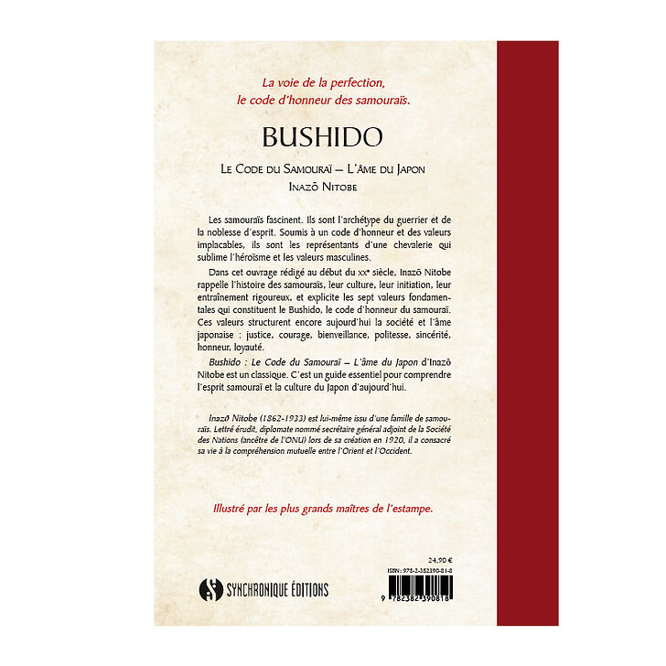 Dans cet ouvrage rédigé au début du XXe siècle, Inazo Nitobe rappelle l'histoire des samouraïs, leur culture, leur initiation, leur entraînement rigoureux, et explicite les sept valeurs fondamentales qui constituent le Bushido, le code d'honneur du samouraï.