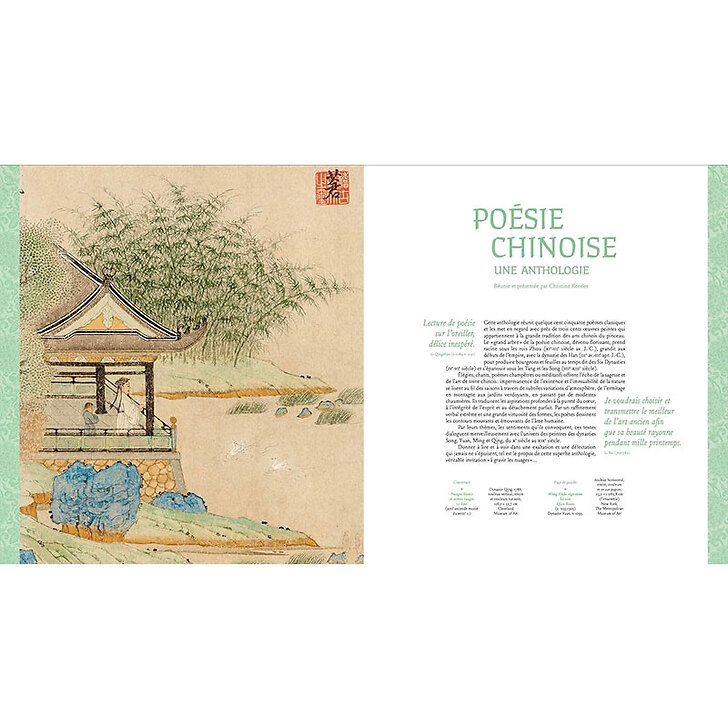 Cette anthologie réunit quelque 150 poèmes classiques et les met en regard avec près de 300 œuvres peintes qui appartiennent à la grande tradition des arts chinois du pinceau.