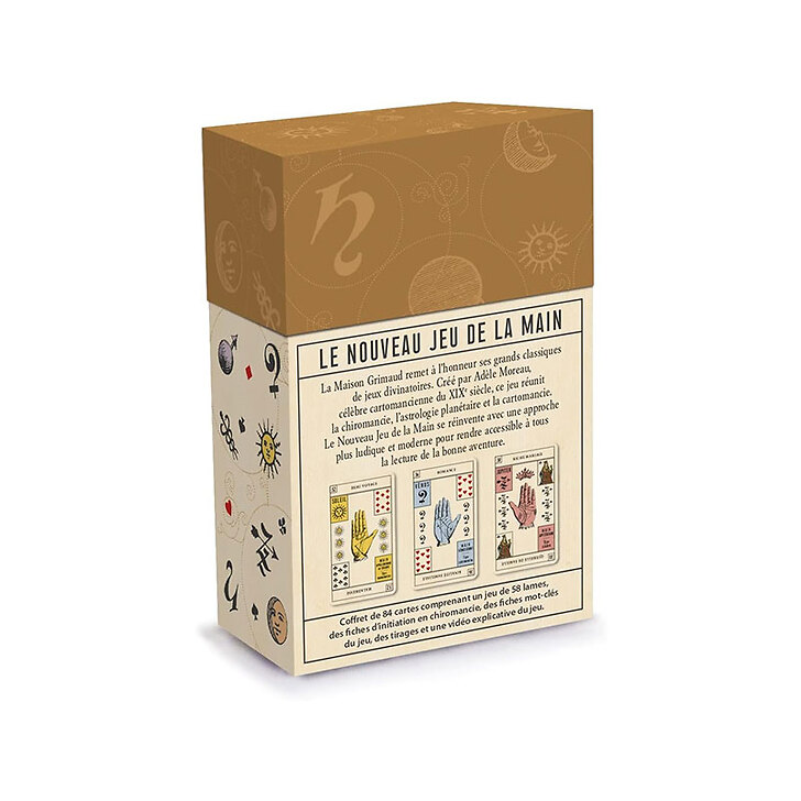 La Maison Grimaud remet à l'honneur ses grands classiques de jeux divinatoires. Créé par Adèle Moreau, célèbre cartomancienne du XIXe siècle, ce jeu réunit la chiromancie , l'astrologie planétaire et la cartomancie. Le Nouveau Jeu de la Main se réinvente avec une approche plus ludique et moderne pour rendre accessible à tous la lecture de la bonne aventure.