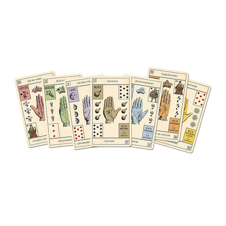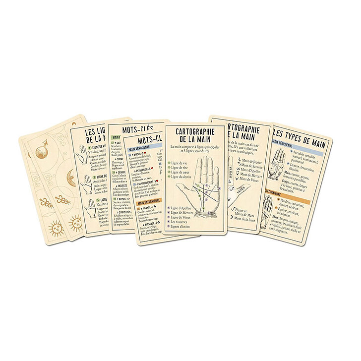 Coffret de 84 cartes comprenant un jeu de 58 lames, des fiches d'initiation en chiromancie, des fiches mots-clés du jeu, des tirages et une vidéo explicative du jeu.