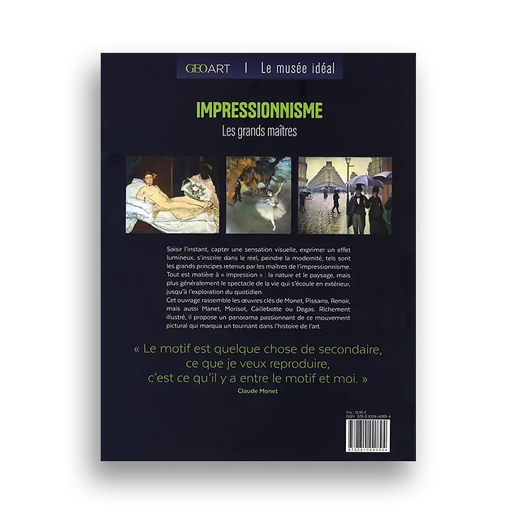 Saisir l'instant, capter une sensation visuelle, exprimer un effet lumineux, s'inscrire dans le réel, peindre la modernité, tels sont les grands principes retenus par les maîtres de l'impressionnisme. Tout est matière à "impression" : la nature et le paysage, mais plus généralement le spectacle de la vie qui s'écoule en extérieur, jusqu'à l'exploration du quotidien. Cet ouvrage rassemble les oeuvres clés de Monet, Pissarro, Renoir, mais aussi Manet, Morisot, Caillebotte ou Degas.