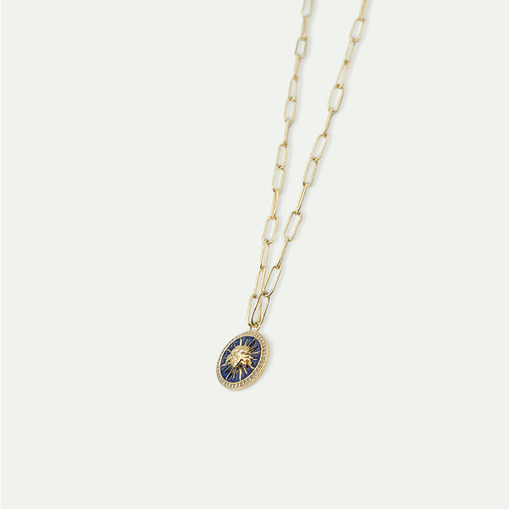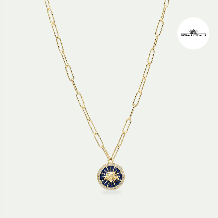 Collier chaîne en grosses mailles en laiton doré à l'or fin, amulette bleu roi émaillée et ornée d'un soleil doré, cristaux facettés.
