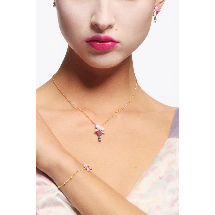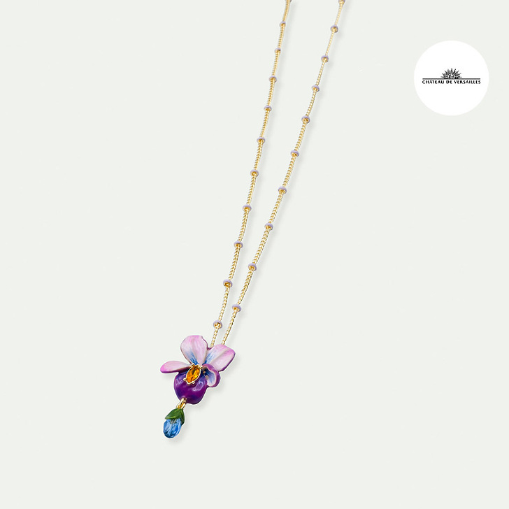 Pendentif fleur de violette émaillé à la main et serti d'un cristal facetté au centre de la fleur. Une tendre pensée pour un être cher, l'expression du souvenir et de la considération.
