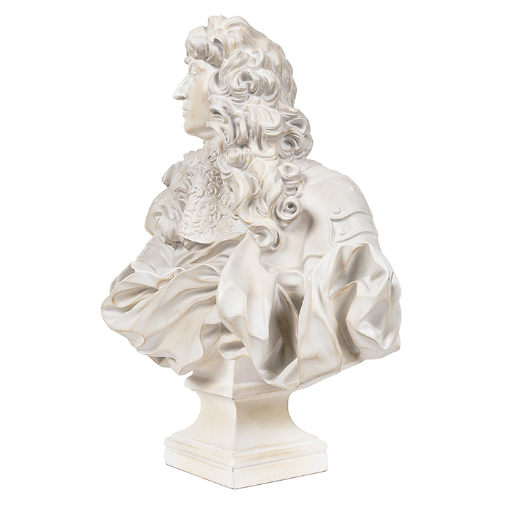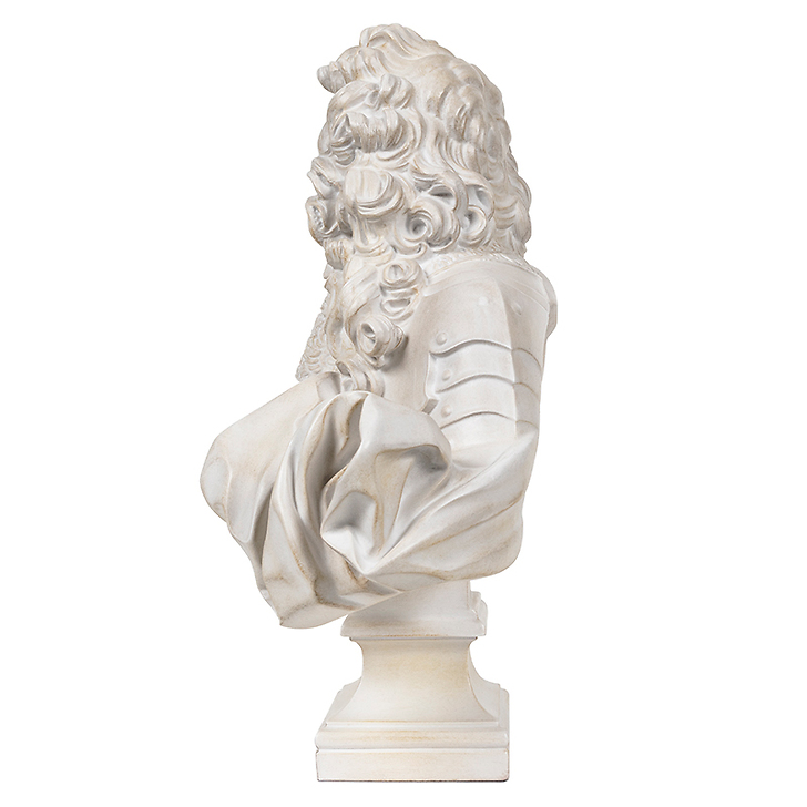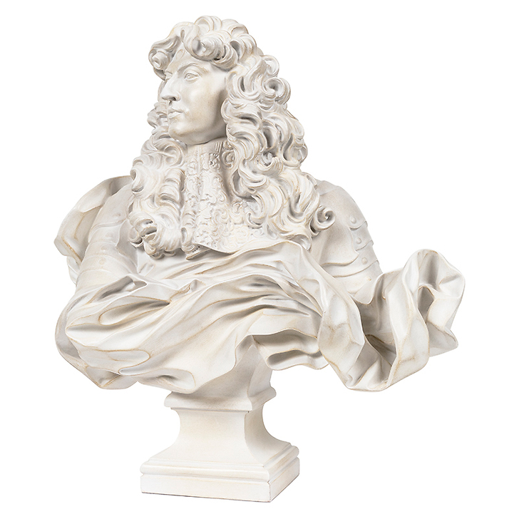 Louis XIV profite du séjour du sculpteur renommé et admiré dans l'Europe entière pour lui commander un buste. Réalisé en moins de 4 mois, Le Bernin représente le souverain en armure, le regard conquérant, porté au loin : c'est l'image d'un roi héroïque, tourné vers le futur qu'il donne ici à voir. Malgré les difficultés qu'a présenté le travail du marbre, rendu difficile par sa fragilité, le buste regorge de détails impressionnants, que ce soit dans les boucles des cheveux du roi, dans les drapés - dont l'aspect virevoltant renforce l'impression d'héroïsme qui se dégage du roi - ou dans la dentelle du jabot, réalisé sans modèle. Tous ces détails contribuent à élever la figure du roi - sa beauté, son héroïsme, sa richesse tout particulièrement. Le Bernin a également maintenu quelques détails réalistes contre l'avis du roi : une verrue à la racine du nez, les poils du menton, détails qui créent un contraste intéressant avec les parties idéalisées de la sculpture, dont les yeux sculptés plus grands que ceux du roi.