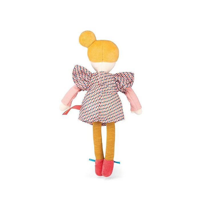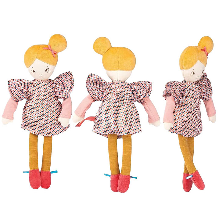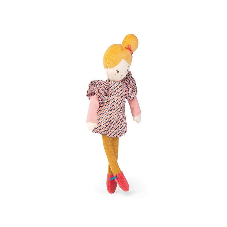 Mademoiselle Agathe est une petite poupée raffinée, très couture, aimant flâner dans Paris. Pour les beaux jours, elle a revêtu sa robe rose à manches papillon parsemée de motifs délicats, portée sur un legging en jersey moutarde et coiffée d'un chignon.