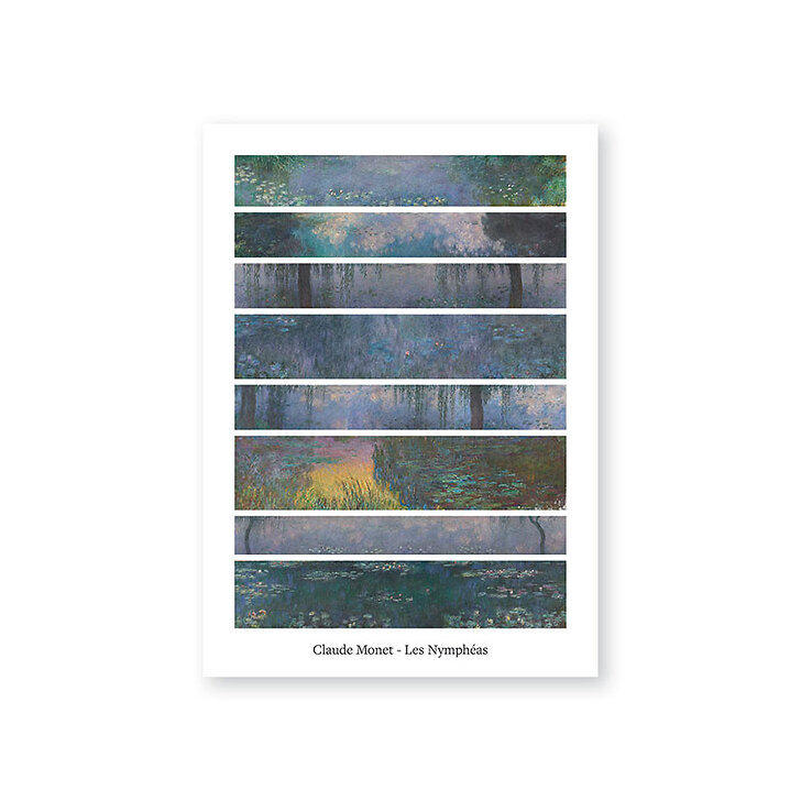 Cette affiche présente 8 vues de la série des Nymphéas de Claude Monet, entre 1914 et 1926, conservés au musée de l'Orangerie.