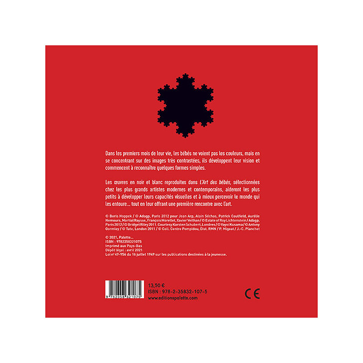 Les œuvres en noir et blanc reproduites dans L'Art des bébés, sélectionnées chez les plus grands artistes modernes et contemporains, aideront les plus petits à développer leurs capacités visuelles et à mieux percevoir le monde qui les entoure... tout en leur offrant une première rencontre avec l'art.