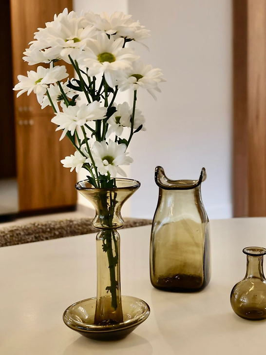 Ils sont entièrement réalisés à la main et chaque création est unique. Par conséquent, il peut y avoir une légère variation de couleur, de texture et de taille entre chaque pièce (environ 1 cm à 2 cm d'une pièce à l'autre). Sur la base de chaque objet, on peut sentir la marque de pontil laissée par la canne du souffleur de verre. La présence de cette marque indique que le verre a été soufflé à main levée. C'est la beauté du fait main.