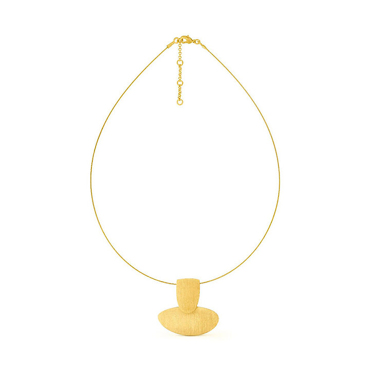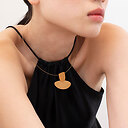 Collier en métal mat doré avec bain d'or de 24 K aux formes irrégulières qui rendent hommage aux corps féminins volumétriques des iconiques déesses de marbre des îles Cyclades. Conception basée sur les dessins de l'illustratrice et artiste graphique barcelonaise Judit Canela.
