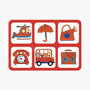 Jeu d'éveil en carton regroupant quatre planches de couleurs primaires, aux illustrations d'objets du quotidien, traité comme un imagier, reprenant l'association graphique de la gamme. « Un loto pour observer, apprendre et nommer les couleurs et les objets ».