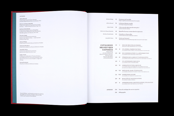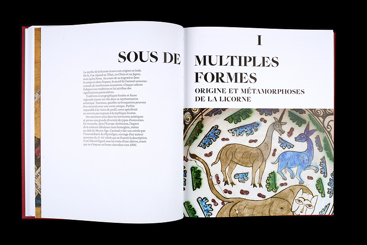 Les essais de grands spécialistes abordent les grandes thématiques développées dans l'exposition : la diversité des formes de la licorne entre Orient et Occident ; son rôle dans la Bible et les bestiaires médiévaux ; les récits de voyageurs comme Marco Polo qui en attestaient l'existence ; son interprétation religieuse à travers notamment de la figure de la Vierge et la licorne ; ou encore ses usages symboliques dans les arts décoratifs et la science, du remède supposé tiré de sa corne aux emblèmes héraldiques.