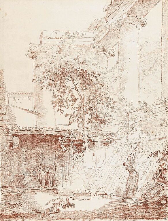Femme étendant du linge, dans une cour (affiches d'art)