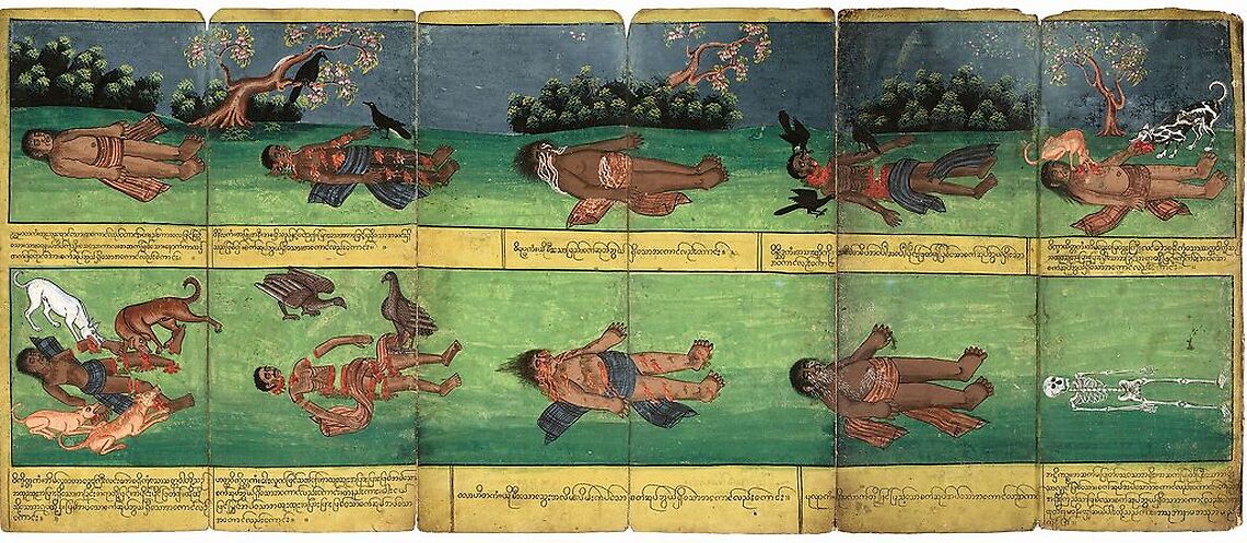 Œuvre de : Saya Ko Kya Nyun SAYA KO KYA NYUN Nemi Jataka (détail), 1869, manuscrit de type parabaik, art Mandalay, Birmanie (Myanmar) Encre et couleurs sur papier. H. 53,5 ; L. totale 950 cm © Photo Rmn - Grand Palais (MNAAG, Paris) - T. Ollivier © Rmn - Grand Palais, Paris 2019