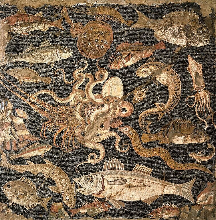 Œuvre de : Anonyme Mosaïque représentant une bataille entre une pieuvre et un homard (détail), IIe siècle avant J.-C., Anonyme © Photo Archives Alinari, Florence, dist. Rmn-GP - L. Pedicini I © Rmn - Grand Palais, Paris 2020