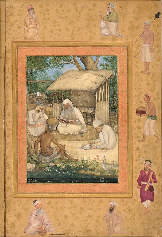 Saint homme et ses disciples étudiant un texte sacré (affiches d'art)