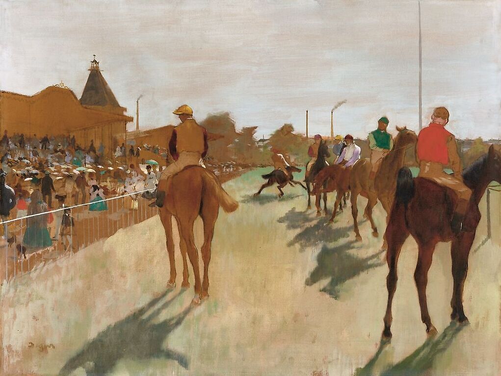 Œuvre de : Degas, Edgar Technique : Huile sur papier marouflé Degas, Edgar - Chevaux de course, devant les tribunes [dit aussi Le Défilé] (détail) - Paris, musée d'Orsay. © Photo Rmn-GP (musée d'Orsay) - H. Lewandowski © Rmn-Grand Palais, Paris 2023