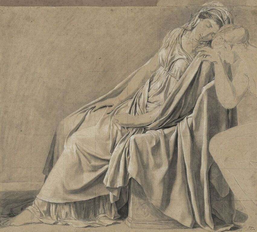 Œuvre de : David, Jacques Louis Technique : Pierre noire et rehauts de blanc, mis au carreau à la pierre noire David, Jacques Louis - Sabine, étude pour Le Serment des Horaces - Pierre noire et rehauts de blanc, mis au carreau à la pierre noire Angers, musée des Beaux-Arts