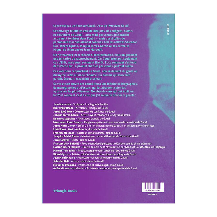 Ceci n'est pas un livre sur Gaudí. C'est un livre avec Gaudí. Cet ouvrage réunit les voix de disciples, de collègues, d'amis et d'ouvriers de Gaudí - autant de personnes qui seraient autrement tombées dans l'oubli -, mais aussi celles de personnalités mondialement connues, tels les artistes Salvador Dali, Picard Opisso, Joaquín Torres-Garcia ou les écrivains Miguel de Unamuno et Joan Maragall. On ne trouvera ici ni théorie ni Interprétation, mais uniquement une tentative de rapprochement.