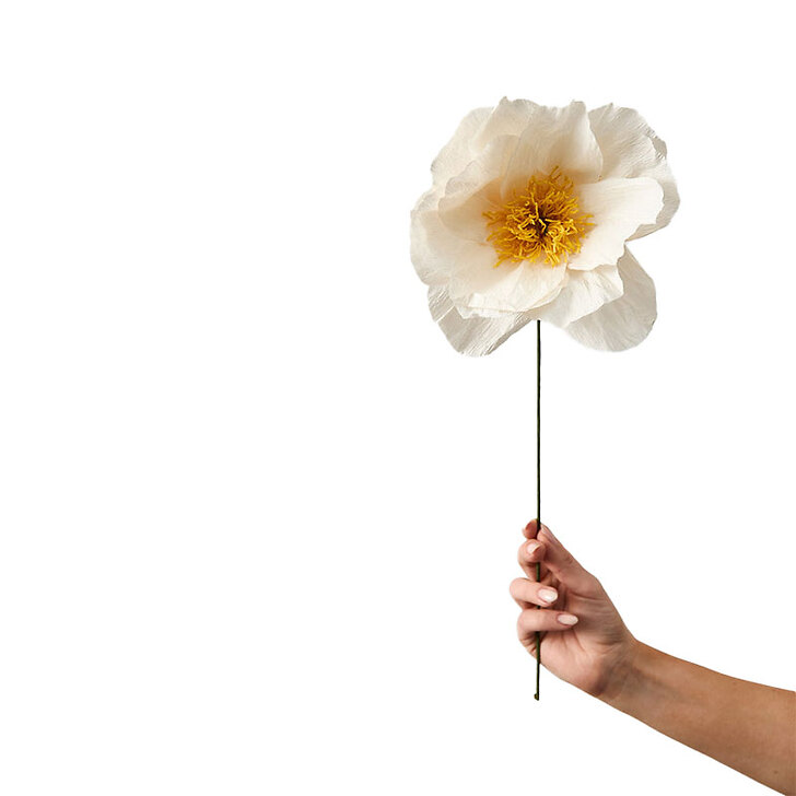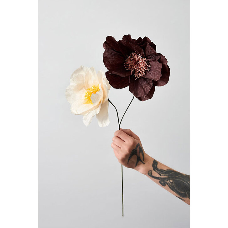 Cette fleur est confectionnée en papier crépon teint et fixée sur une longue tige verte flexible. Vous pouvez facilement modeler la tige pour obtenir la forme et la longueur souhaitées.